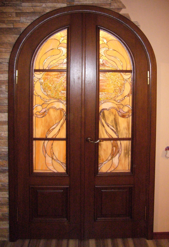 • глухие и оснащённые стеклянными вставками. Наряд арочной двери из дерева успешно дополнит витражный элемент и т. д.