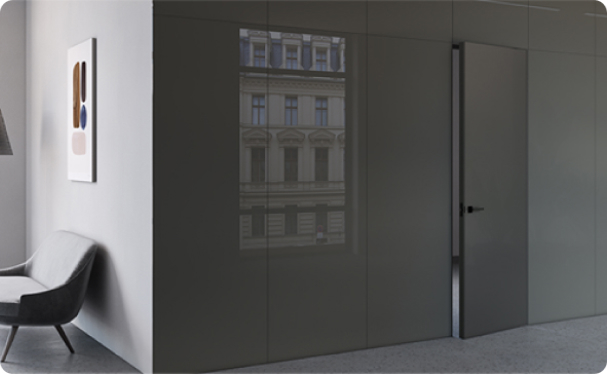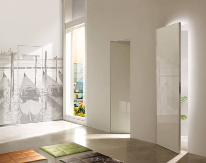 Двери комплектуются скрытыми, регулируемыми в трех плоскостях и с открыванием до 180°(зависит от способа монтажа) петлями и бесшумными магнитными замками с пластиковым язычком итальянского производства. Доступны к заказу раздвижные двери и стеновые панели в цвет дверей.