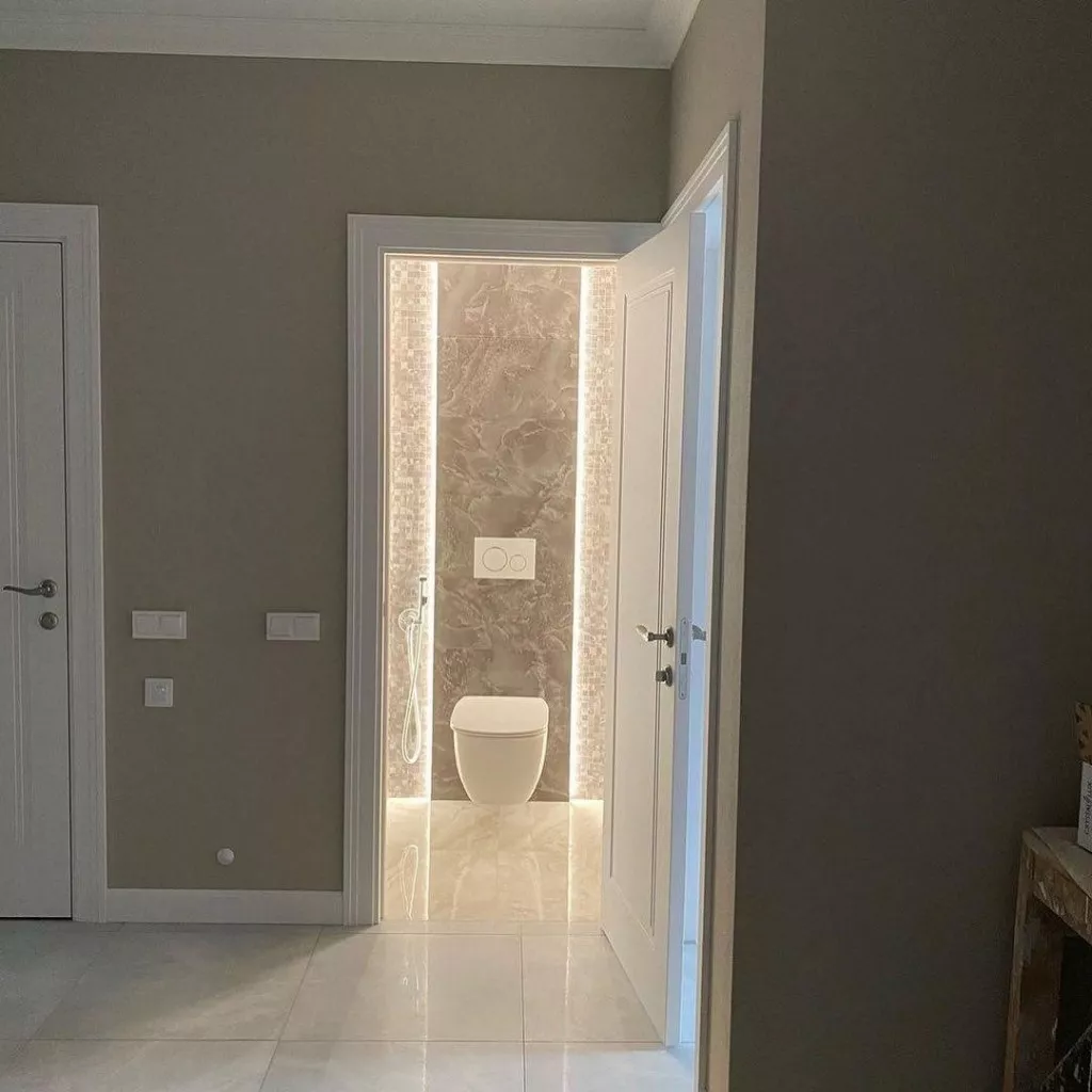 - Двери под цвет стен: Создают единое пространство, особенно в маленьких санузлах.