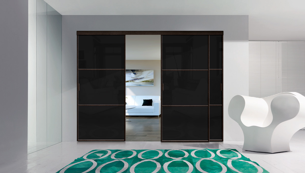 Чёрные раздвижные двери в отделке шпоном, эмалью, ламинатом. Продажа и помощь в монтаже