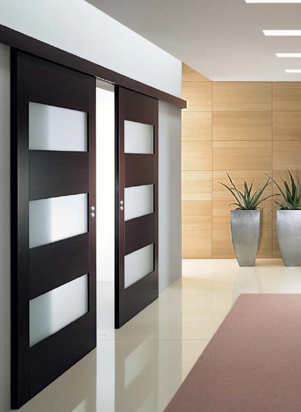 • из дерева, используемого как массив или шпон. Популярны створки, произведённые с применением дуба, ясеня, экзотических пород, которые в естественном виде имеют насыщенный оттенок. Благородная, аристократическая красота чёрных раздвижных дверей уместна в интерьерах любого дизайна;
