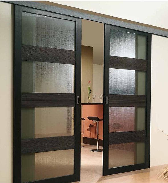 Деревянные раздвижные двери, фото и цены которых можно найти в каталогах производителей, могут иметь и более сложное исполнение. Например, встроенная модель оборудуется металлическим пеналом. Конструкция, которая скользит и одновременного вращается при открывании, поставляется вместе со специальным роторным механизмом, и т. д.