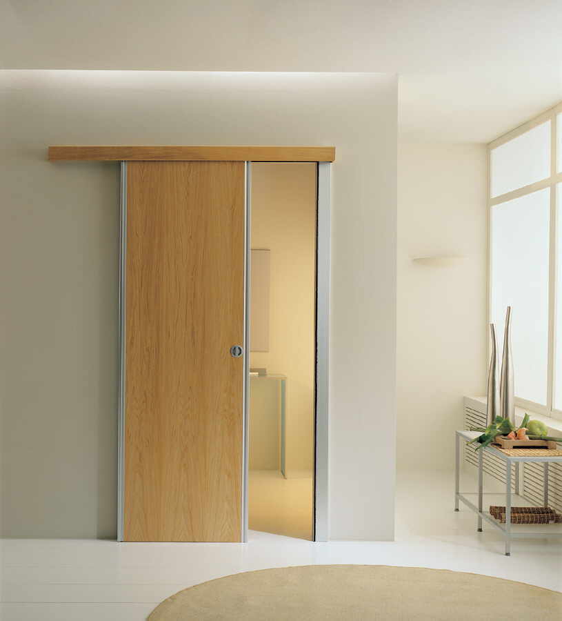• алюминиевый рельс - одно- или многоканальный, рассчитанный на установку в верхней части проёма. Видоизменённая нижняя направляющая врезается не в пол, а в торец полотна, оставаясь полностью скрытой из вида. Её задача - контролировать вертикальное положение изделия;
