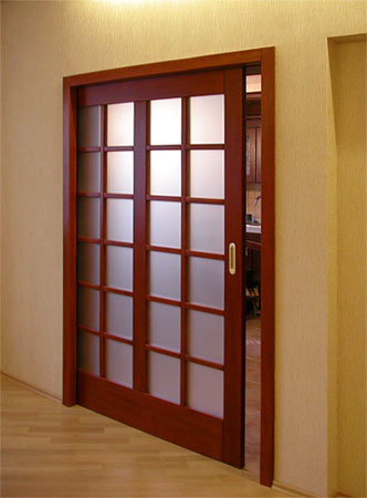 • обладающие глухим устройством либо оборудованные стеклянными вставками различных размеров. Купить деревянную сдвижную дверь с крупным светопрозрачным заполнением - замечательная идея для помещения, страдающего от ограниченности и перегрузки мебелью;
