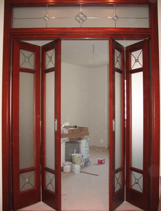 4. визуально непроницаемые и остеклённые. Облик межкомнатных дверей-книжек с фрамугами, оборудованными стеклом, более изящен и воздушен. При этом светопрозрачные элементы могут присутствовать или не присутствовать в оформлении створки;