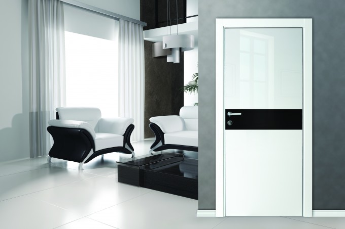Самым простым и распространённым вариантом такого решения является конструкция, оснащённая вставкой другого цвета. Посмотреть на изделия, сочетающие светлое полотно с чёрным стеклом, предлагает коллекция Torino от Academy. Они звучат экспрессивно, оригинально, но при этом не перегружают интерьер.