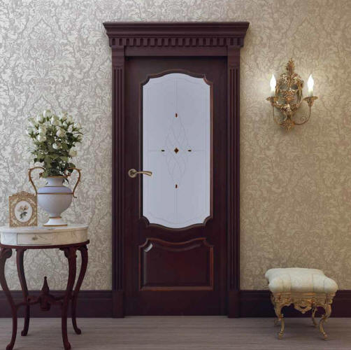 • стеклянными вставками, которые дополняются гравировками, кристаллами, превращаются в витражи. Сложно найти что-то столь же изящное, как классическая деревянная межкомнатная дверь с воздушным светопрозрачным заполнением;
