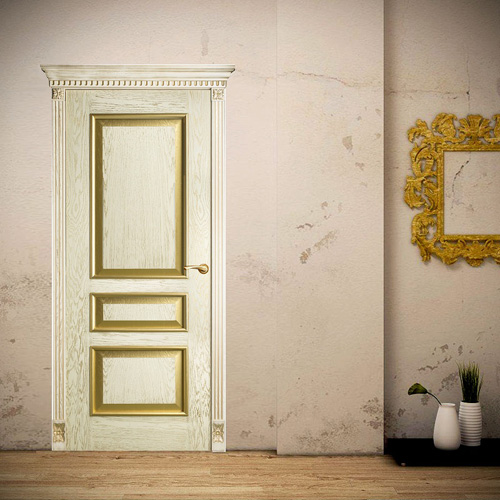 • натуральное дерево в виде массива или шпона. Особое очарование присуще классическим дверям с патиной, которые подчинены направлению кантри. Нарочито необработанное изделие, в углубления которого нанесён тёмный лак, а по всей поверхности видны потёртости, царапины и другие следы времени, - результат кропотливого труда художников и дизайнеров;