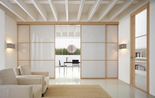 • экономии полезной площади. За счёт того, что створка перемещается вдоль стены, участок перед проёмом, обычно отводимый для распахивания полотна на петлях, остаётся незанятым;