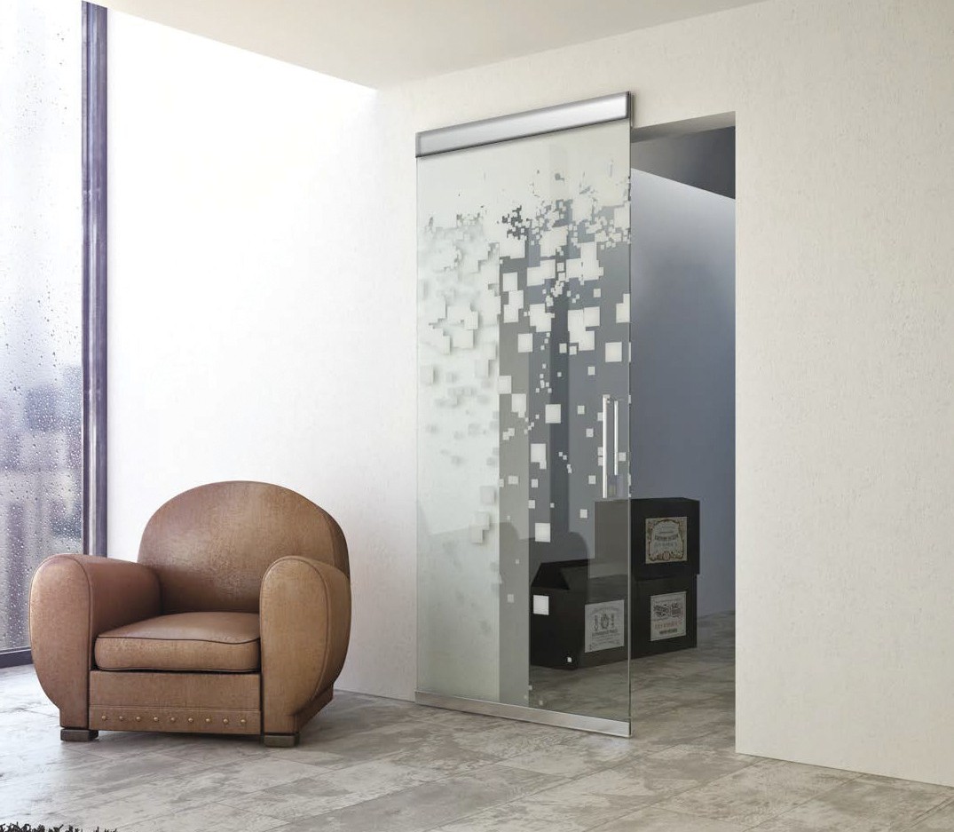 2. интеграция рельса в верхнюю часть полотна. На виду остаётся лишь сама секция, которая легко и плавно скользит вдоль проёма и стены. Подчёркивая модную немногословность подобных инженерных решений, производители не комплектуют их наличниками и доборами. Некоторые модели такого рода прекрасно обходятся даже без коробок. Невесомость, которая особенно приветствуется современными ансамблями, - главное достоинство изделий;