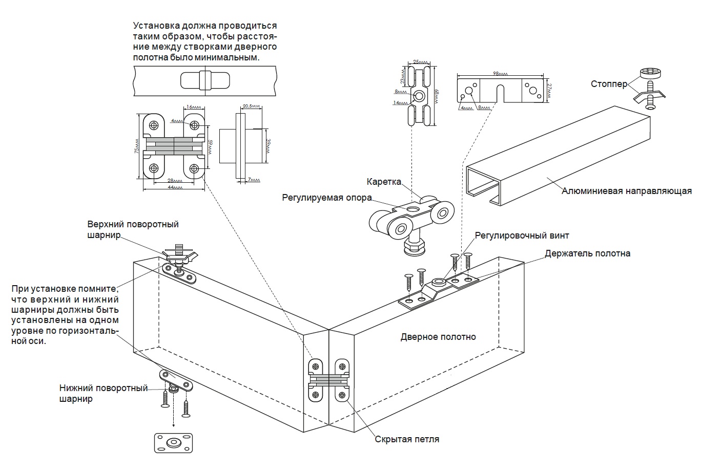 2. раздвижной механизм. В сборке двери-книжки используют рельс, длина которого равна ширине створки в закрытом виде, поскольку за границы проёма изделие такого типа не выходит. Профиль встраивают в верхнюю часть рамы, что позволяет скрыть его из поля зрения. Также в набор включаются ролики, отвечающие за перемещение секций, и фиксатор;