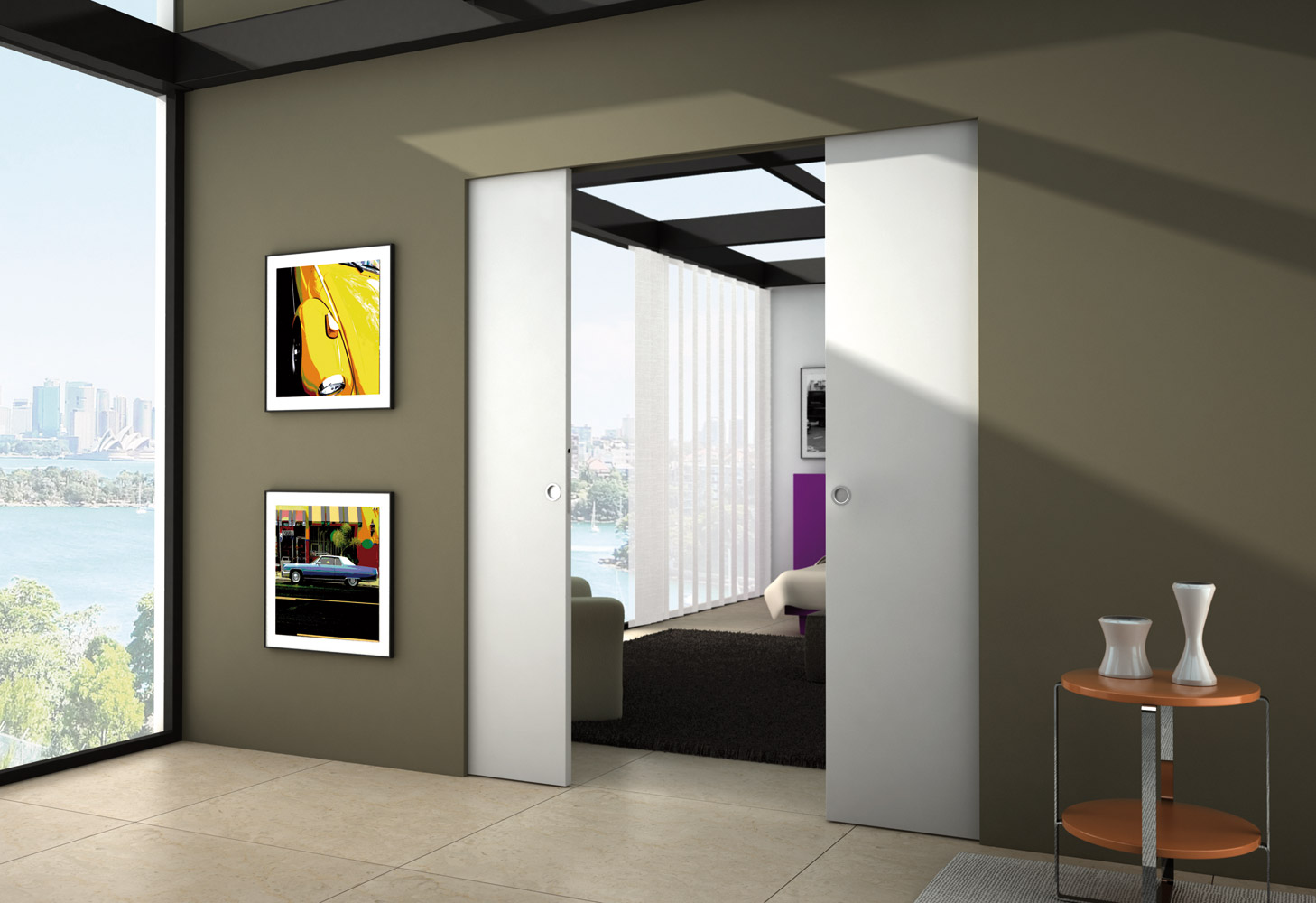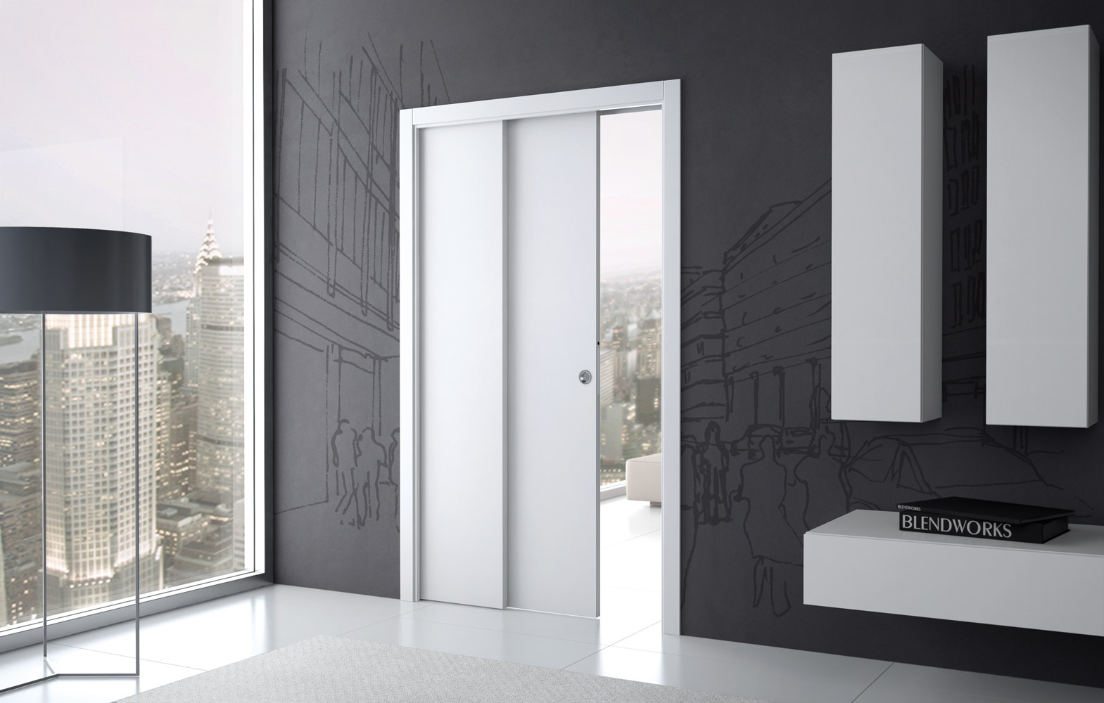 создать эффект плавного перетекания одной комнаты в другую. Створка в открытом положении исчезает внутри стены, не мешая смежным зонам свободно «общаться» друг с другом, формируя единое пространство.