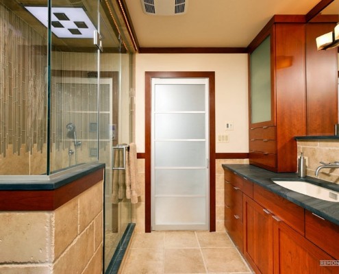 • дверь в ванную из матового стекла - это универсальное украшение, которое замечательно сочетается с любыми материалами, расцветками, направлениями дизайна;