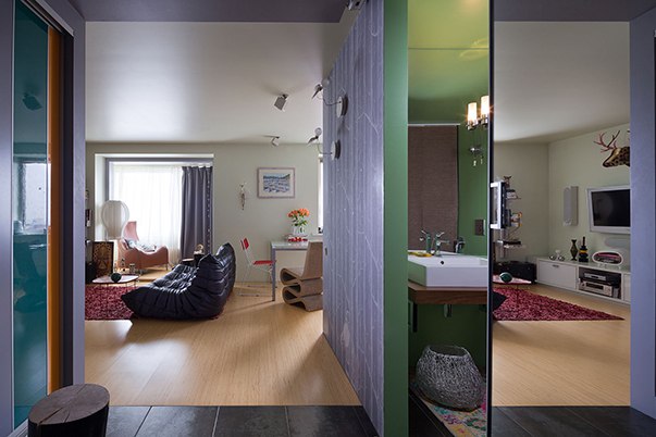 • оформленными в любой стилистике. Дизайн встроенных дверей в ванной комнате ничем не отличается от дизайна прочих межкомнатных конструкций, даже если они открываются другими способами. В коридоре или прихожей можно спокойно объединять разные технические решения.