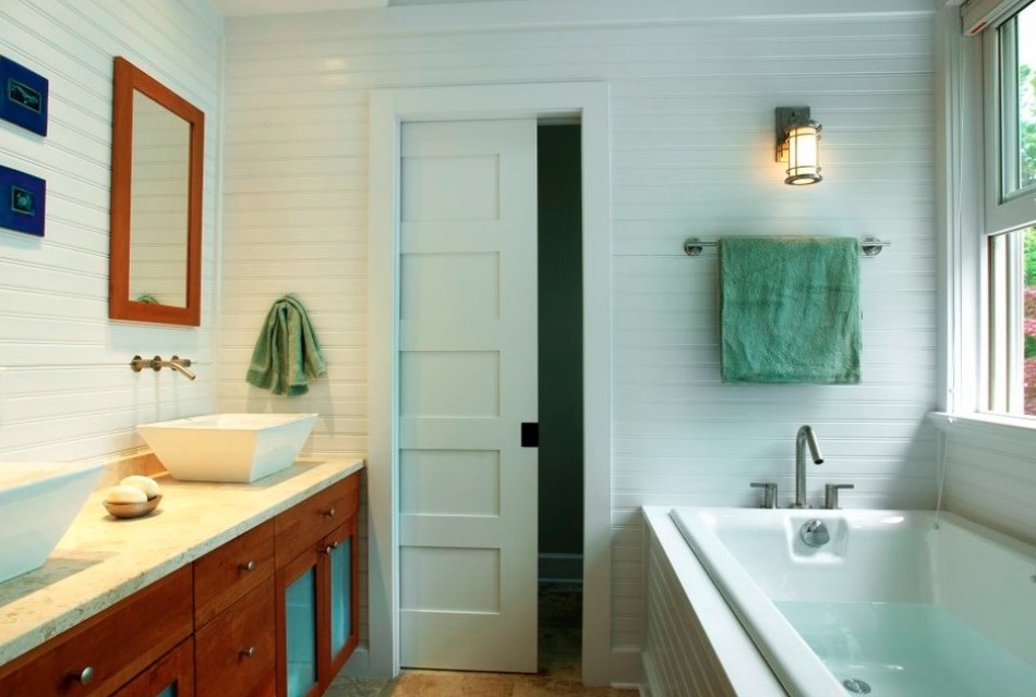1. обустройства малогабаритной площади. Небольшие помещения для гигиенических процедур - традиционное явление для квартир стандартной застройки. Поэтому вопрос экономии квадратных метров не теряет актуальности. Встроенная дверь в ванную комнату принесёт свежие идеи оформления, высвободит территорию вокруг проёма, обеспечит лучшее соседство санузла с небольшой прихожей;