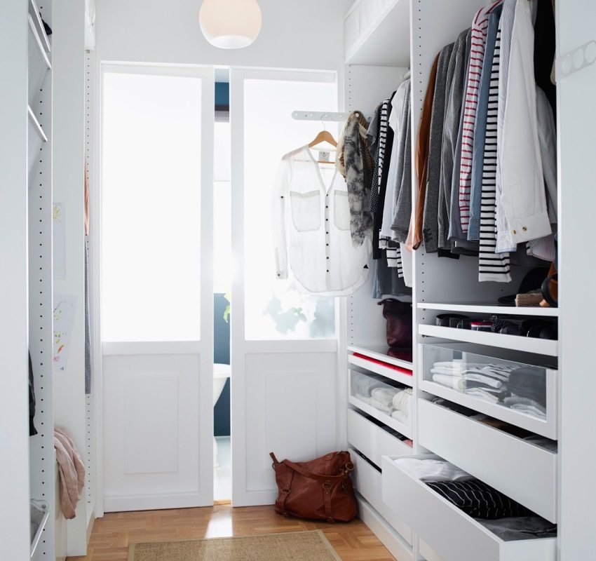 2. отдать предпочтение нейтральному решению, выполненному в спокойной белоснежной или светло-древесной гамме либо изготовленному из стекла. Из светопрозрачных материалов производят изящные и универсальные встроенные двери-купе в гардеробную стилей классика и модерн. Особенно востребованы визуально непроницаемые, но лёгкие и утончённые полотна из матового, крашеного, оклеенного полимерной плёнкой стекла;
