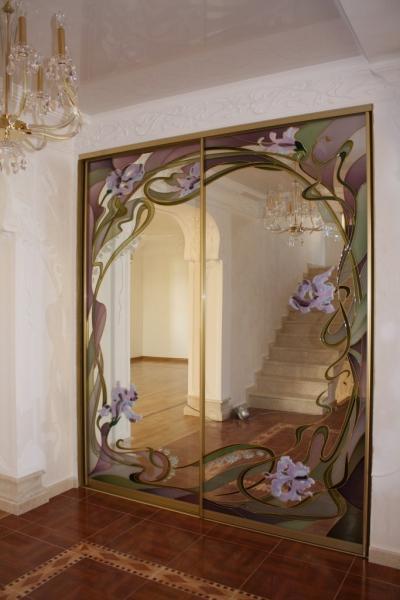 Великолепными эстетическими характеристиками и доступной ценой привлекательны зеркальные двери-купе с пескоструйным рисунком. Данный метод декорирования считается одним из наиболее простых, но результат восхищает подробностью деталей и долговечностью. Дабы получить нужный орнамент, на поверхность листа под высоким давлением подают песок, предварительно установив трафарет. Мастер несколько раз вырезает рисунок, гравирует отдельные его элементы, при необходимости использует краски.